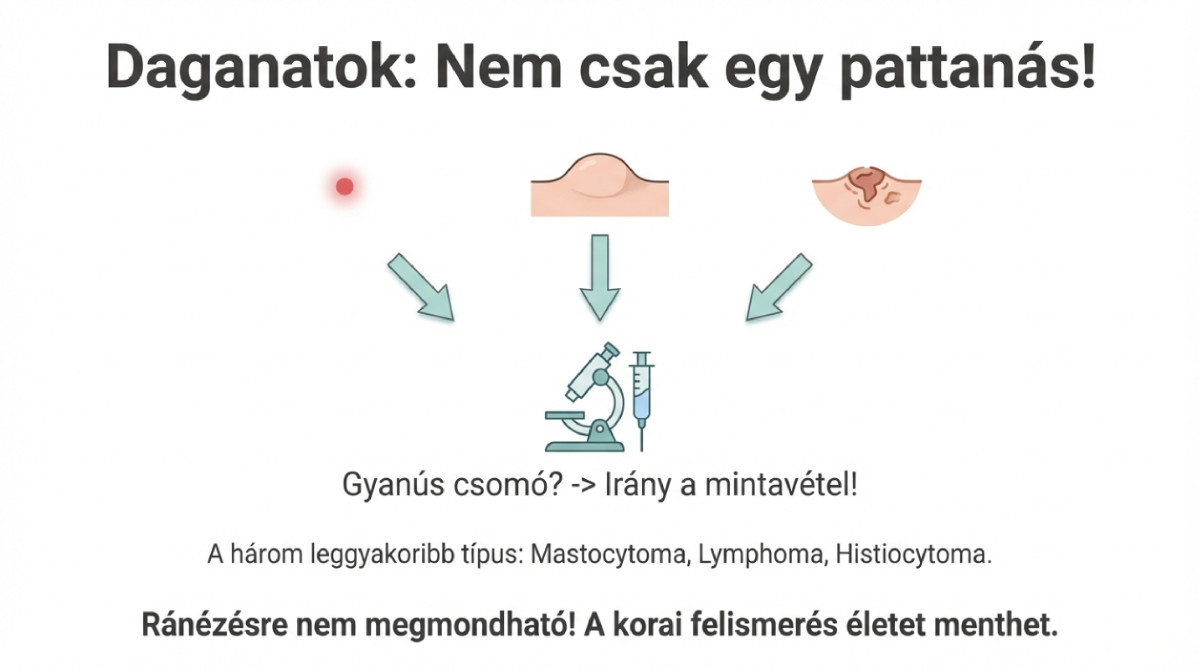 A pontos diagnózishoz elsőként egy vékonytű aspirációs mintavétel (citológia) történik, amely során sejteket nyerünk ki a daganatból. Ennek levételéhez nem szükséges altatás, cserébe csak pár sejtet vizsgálnak mikroszkóp alatt. Ezt sokszor kiegészíti a biopsziás (szövettani) vizsgálat is, amely egy „mini műtét”, de részletesebb információt ad a daganat típusáról és viselkedéséről. Emellett hasi ultrahang és mellkasröntgen is javasolt annak megállapítására, hogy van-e áttét a belső szervekben, és a környéki nyirokcsomók vizsgálata sem maradhat el. Ezek az információk alapján történhet meg a stádiumba sorolás.